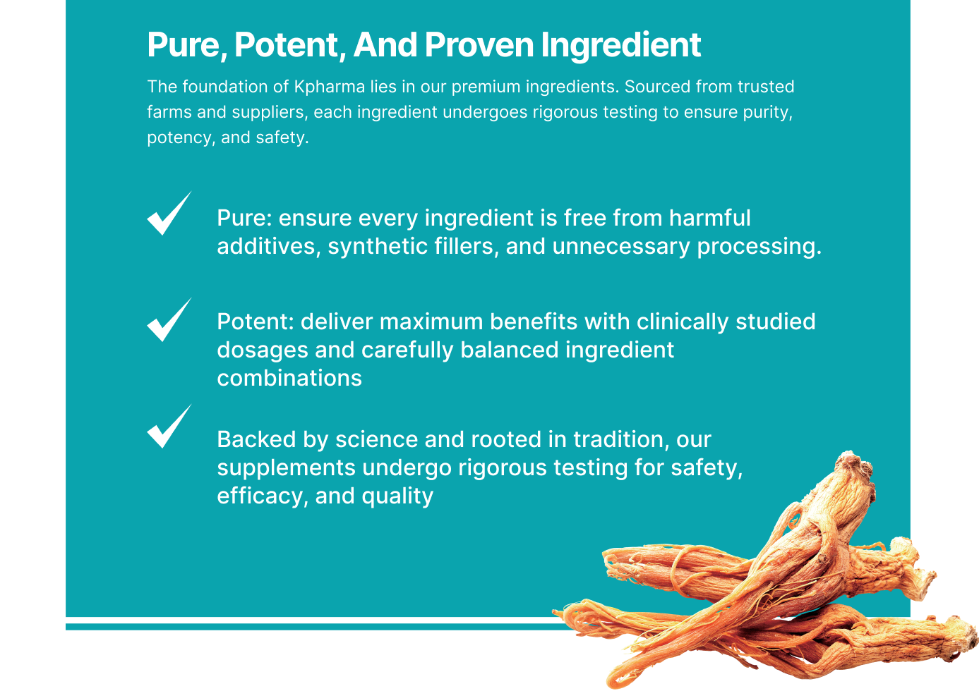 Our products are not just supplements; they are the result of careful research and innovative formulation. Each Kpharma product is designed to address specific health needs using the most effective natural ingredients. We believe in transparency and ensuring every capsule or serving contains the potency you expect and the quality you deserve.